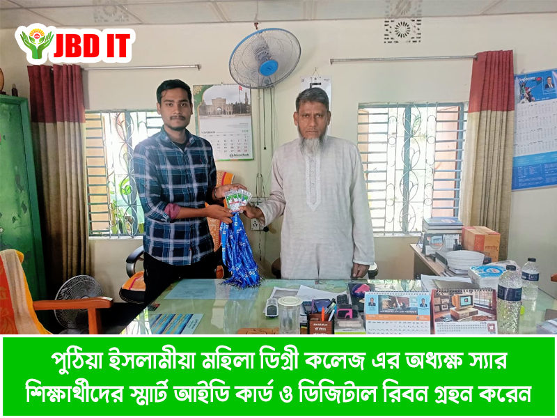 পুঠিয়া ইসলামীয়া মহিলা ডিগ্রী কলেজ এর ২০২৫-২০২৬ শিক্ষার্থীদের স্মার্ট আইডি কার্ড ও ডিজিটাল রিবন হস্তান্তর করা হয়। সেই সময় উপস্থিত ছিলেন অত্র প্রতিষ্ঠানের সম্মানীত অধ্যক্ষ মহাদয় এবং অন্যান্য শিক্ষক বৃন্দ। এছাড়াও স্মার্ট আইডি কার্ড ব্যবহার এর জন্য ডিজিটাল এটেনডেন্স ডিভাইস সেটআপ ও ইন্টিগ্রেশন করা হয়। ডিজিটাল শিক্ষাপ্রতিষ্ঠান গড়ার পরিকল্পনায় আরো এক ধাপ এগিয়ে গেল পুঠিয়া ইসলামীয়া মহিলা ডিগ্রী কলেজ, রাজশাহী।